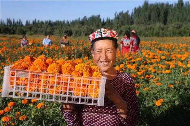 莎车县塔尕尔其镇且克且克兰干村万寿菊喜获丰收(6月29日拍摄)。武勇 摄