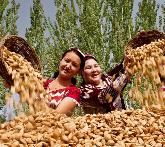 莎车县阿热勒乡农民将丰收的巴旦木倾倒而出,欢声笑语间满是幸福(2023年9月5日摄)。