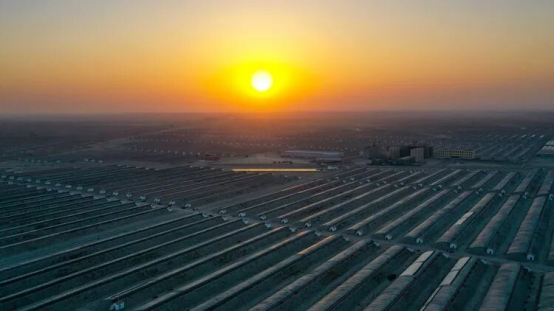夕阳下的莎车县戈壁产业园温室大棚(3月21日摄)。