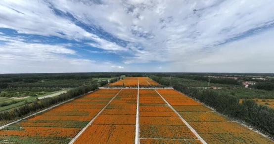 莎车县英吾斯塘乡英吾斯塘村万寿菊盛开,大地如画(2024年8月5日摄)。