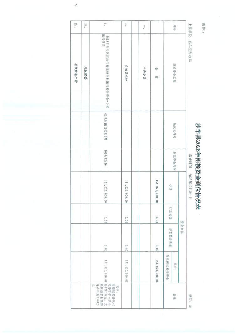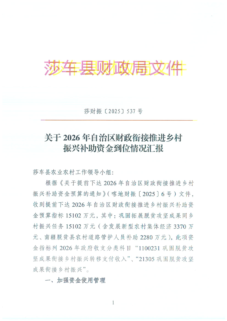 关于2026年自治区财政衔接推进乡村振兴补助资金到位情况汇报-喀地财振[2025]537