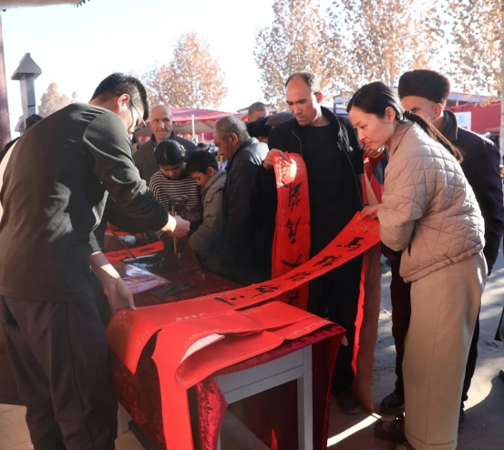 文艺表演之外,写春联送福字活动同样人气爆棚。书法老师摆开案台、挥毫泼墨,遒劲的“福”字与饱含祝福的春联依次成型,排队领取的村民个个笑逐颜开。