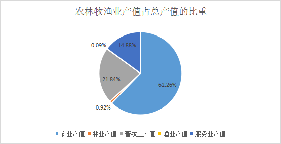 (一)农业运行呈现下滑。2024年二季度农林牧渔业初步反馈总产值426113.15万元,同比下降14.86%,农林牧渔业增加值下拉一产增加值13.5个百分点,下拉生产总值4.6个百分点,其中:农业产值265294.93万元,同比下降23.54%,林业产值3922.09万元,同比增长57.45%,畜牧业产值93079.01万元,同比增长3.95%,渔业产值400.41万元,同比增长50.58%,农林牧渔服务业产值63416.71万元,同比增长0.15%。