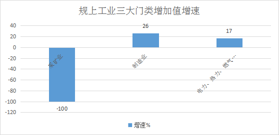 1.从三大门类看。采矿业,制造业,电力、热力、燃气及水生产供应业增加值分别同比下降100%、增长26%和17%。