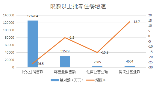 (四)消费市场稳中有升。1-6月,社会消费品零售总额实现146586万元,同比增长12.9%,其中,限额以上社会消费品零售总额实现37004万元,同比增长17.9%,限额以下社会消费品零售总额实现109582万元,同比增长11.2%。从商品销售情况看,批发业销售额158737万元,同比下降25.6%;零售业销售额99893万元,同比增长1.4%。从住餐营业情况看,住宿业营业额8680万元,同比下降13.3%;餐饮业营业额14588万元,同比增长25.9%。