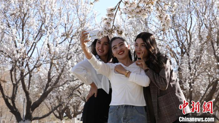 图为几名游客在巴旦木花下自拍。麦麦提艾力·麦麦提明摄