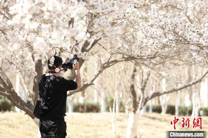 图为一名摄影爱好者在拍摄盛开的巴旦木花。麦麦提艾力·麦麦提明摄
