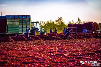 红辣椒结的红彤彤一片,田埂上堆起一座座辣椒“小山”,沙湾县安集海镇辣椒种植户齐先生正往农用车上装辣椒。每年9月到10月,沙湾县的戈壁就成了晒场,方圆几十公里如红色海洋,吸引大量游人来观赏拍照。