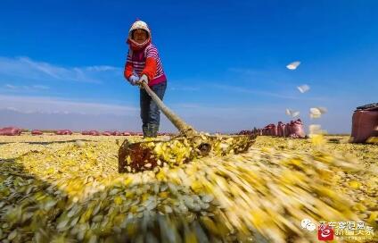 南疆的巴旦木、核桃和花生成熟时,阿勒泰青河县的6万亩向日葵也开始收割。阿格达拉镇种植大户高先生家望不到边的葵花地里,朵朵花盘果实饱满。人们正把割下来的花盘朝上重新插到杆子上,以便晒干水分。这里收获的葵花籽供应给该镇一家葵花籽加工厂,制成小包装的休闲食品销往全国。“这里的瓜子粒大还特别香,总感觉吃不够。而且包装也特别精美耐看,出人意料。”湖南游客徐女士在青河县一家超市买了20包本地瓜子,“这一路可以吃个够了。”