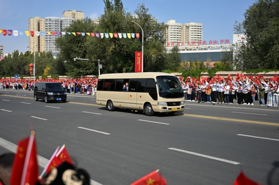 9月23日下午,中共中央总书记、国家主席、中央军委主席习近平率中央代表团乘专机抵达乌鲁木齐,出席新疆维吾尔自治区成立70周年庆祝活动。这是从机场到住地途中,习近平向沿途欢迎的群众挥手致意。新华社记者辛悦卫摄