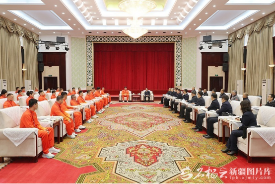 12月4日,自治区党委书记陈小江、自治区主席艾尔肯·吐尼亚孜同载誉归来的第十五届全国运动会新疆体育代表团获奖运动员、教练员代表亲切交谈,代表自治区党委和政府向他们表示热烈祝贺。石榴云/新疆日报记者崔志坚摄
