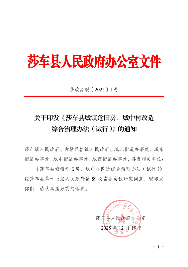 为加快推进我县城镇危旧房、城中村改造工作,改善居民居住条件,提升城市功能品质,根据《中华人民共和国土地管理法》《国有土地上房屋征收与补偿条例》等法律法规,我县制定了《莎车县城镇危旧房、城中村改造综合治理办法(试行)》。该办法已于2025年12月19日经莎车县第十七届人民政府第89次常务会议审议通过,并以(莎政办规〔2025〕1号)文件印发。