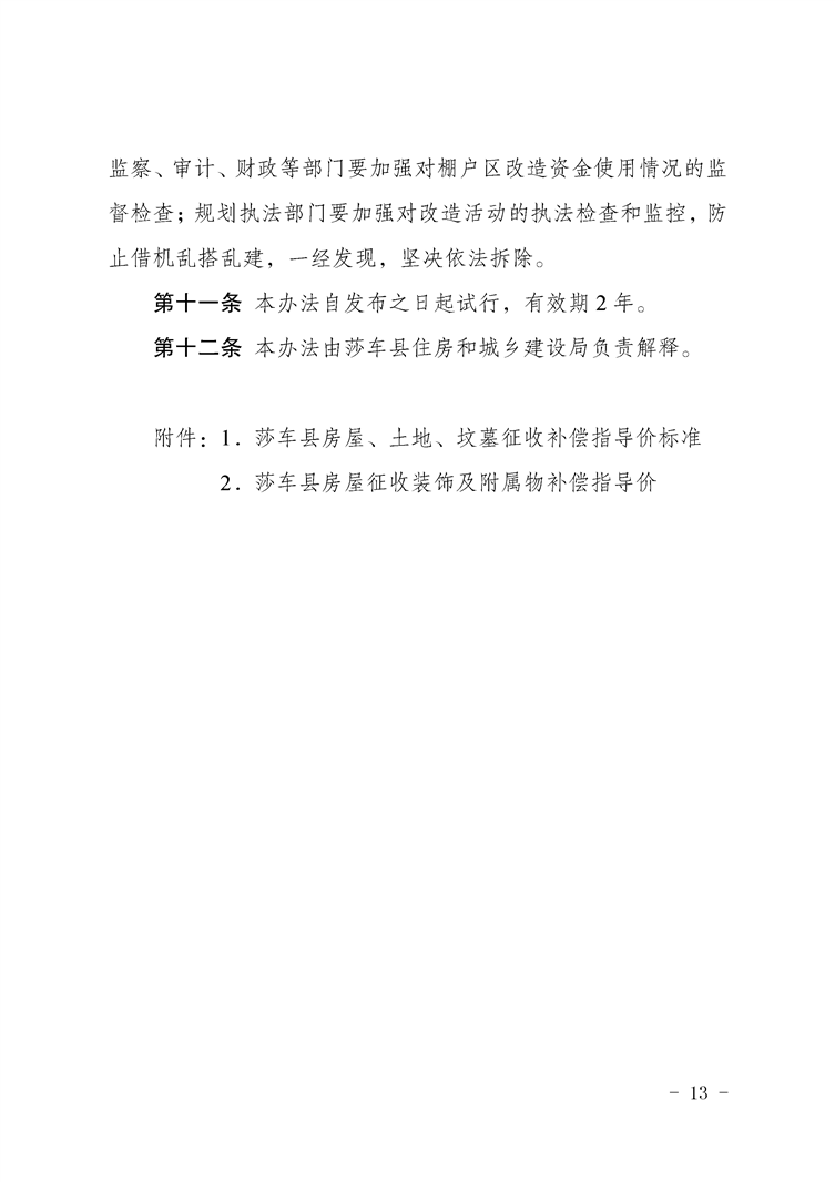 索引号:010390524/2026-00044 文号:莎政办规〔2025〕1号 发布机构:莎车县住房和城乡建设局 成文日期:2025年12月19日 发布日期:2026/03/19 11:03 有效性:现行有效 名称:莎车县城镇危旧房、城中村改造综合治理办法(试行)