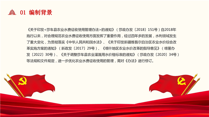 《关于印发<莎车县农业水费征收使用管理办法>的通知》(莎政办发〔2018〕151号)自2018年施行以来,对合理规范农业水费征收使用方面发挥了重要作用,经过四年多的发展,水利领域发生了重大变化,为贯彻落实《中华人民共和国水法》、《关于印发新疆维吾尔自治区农业水价综合改革实施方案的通知》(新政发〔2017〕29号)、《喀什地区农业水价改革的指导意见》(喀署办发〔2022〕30号)、《关于调整莎车县农业灌溉用水价格标准的通知》(莎政办发〔2020〕34号)等法规和文件规定,进一步优化农业水费征收使用的管理,需对《办法》进行修订。