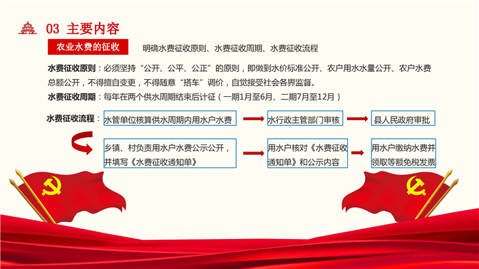 (二)农业水费的征收。明确水费征收原则、水费征收周期、水费征收流程。