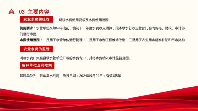(三)农业水费的使用。明确水费使用要求及水费使用范围。