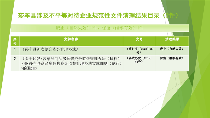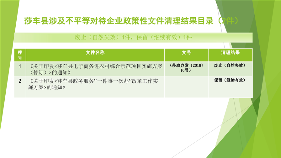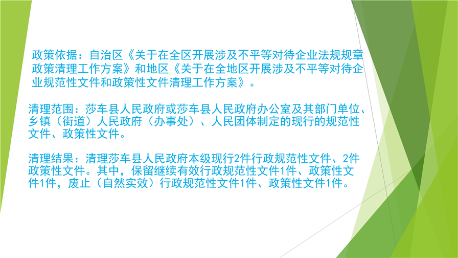 清理结果:清理莎车县人民政府本级现行2件行政规范性文件、2件政策性文件。其中,保留继续有效行政规范性文件1件、政策性文件1件,废止(自然失效)行政规范性文件1件、政策性文件1件。