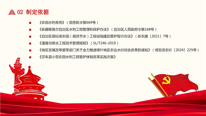 依据《农田水利条例》(国务院令第669号)、《新疆维吾尔自治区水利工程管理和保护办法》(自治区人民政府令第168号)、《自治区高标准农田(高效节水)工程设施建后管护暂行办法》(新农建〔2021〕7号)、《灌溉与排水工程技术管理规程》(SL/T246-2019)、《地区发展改革委等部门关于全力推进喀什地区农业水价综合改革的通知》(喀发改农价〔2024〕225号)、《莎车县小型农田水利工程管护体制改革实施方案》等相关法律法规,结合莎车县实际制定本办法。