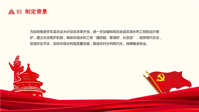 为加快推进莎车县农业水价综合改革步伐,进一步加强和规范全县农田水利工程的运行管护,建立长效管护机制,确保农田水利工程“建得起、管得好、长受益”,服务现代农业,促进农业节水,加快农田水利高质量发展,推进农村水利现代化,保障粮食安全。