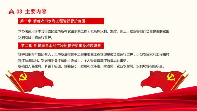 第二章明确农田水利工程的管护组织及相应职责。管护组织为产权所有人,大中型灌排骨干工程主要由工程管理单位负责运行维护,小型农田水利工程由村集体经济组织、农民用水合作组织(协会)、个人等受益主体负责运行维护。