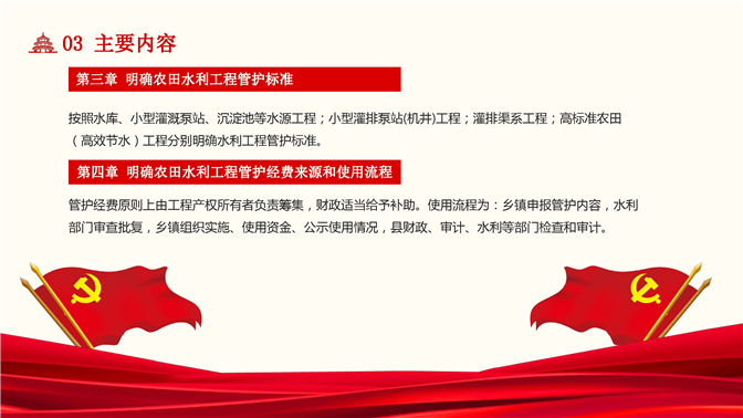 第三章明确农田水利工程管护标准。按照水库、小型灌溉泵站、沉淀池等水源工程;小型灌排泵站(机井)工程;灌排渠系工程;高标准农田(高效节水)工程分别明确水利工程管护标准。