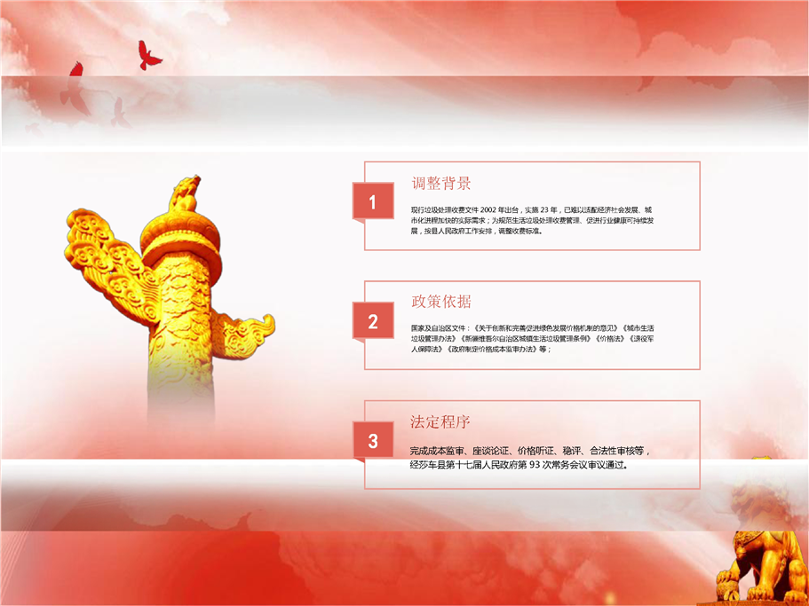 2.根据《中华人民共和国价格法》《中华人民共和国退役军人保障法》《政府制定价格成本监审办法》《政府制定价格听证办法》《政府制定价格行为规则》《国家税务总局财政部自然资源部住房和城乡建设部中国人民银行关于土地闲置费城镇垃圾处理费划转有关征管事项的公告》(2021年第12号)和《新疆维吾尔自治区行政规范性文件管理办法》(自治区人民政府令第218号)等有关政策和文件要求,莎车县发展改革委对莎车县城市生活垃圾处理成本进行了成本监审,结合莎车县实际,制定了《关于调整莎车县城市生活垃圾处理费的初步方案》,依法依规履行了座谈论证、征求书面意见、集体审议、价格听证、社会稳定风险评估、合法性审核等程序,经莎车县第十七届人民政府第93次常务会议研究同意,起草了《关于调整莎车县城市生活垃圾处理收费标准的通知》(以下简称《通知》)。