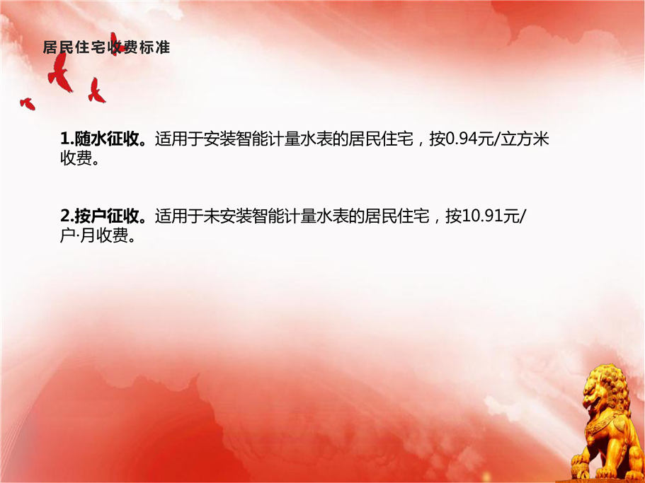 随水征收。适用于安装智能计量水表的居民住宅,按0.94元/立方米收费。