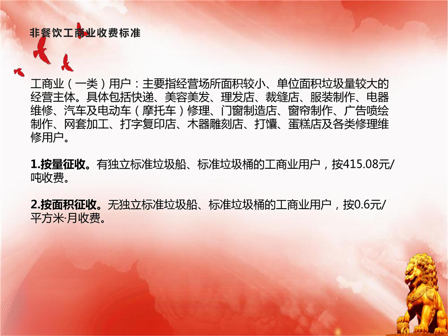 (1)工商业(一类)用户:主要指经营场所面积较小、单位面积垃圾量较大的经营主体。具体包括快递、美容美发、理发店、裁缝店、服装制作、电器维修、汽车及电动车(摩托车)修理、门窗制造店、窗帘制作、广告喷绘制作、网套加工、打字复印店、木器雕刻店、打馕、蛋糕店及各类修理维修用户。