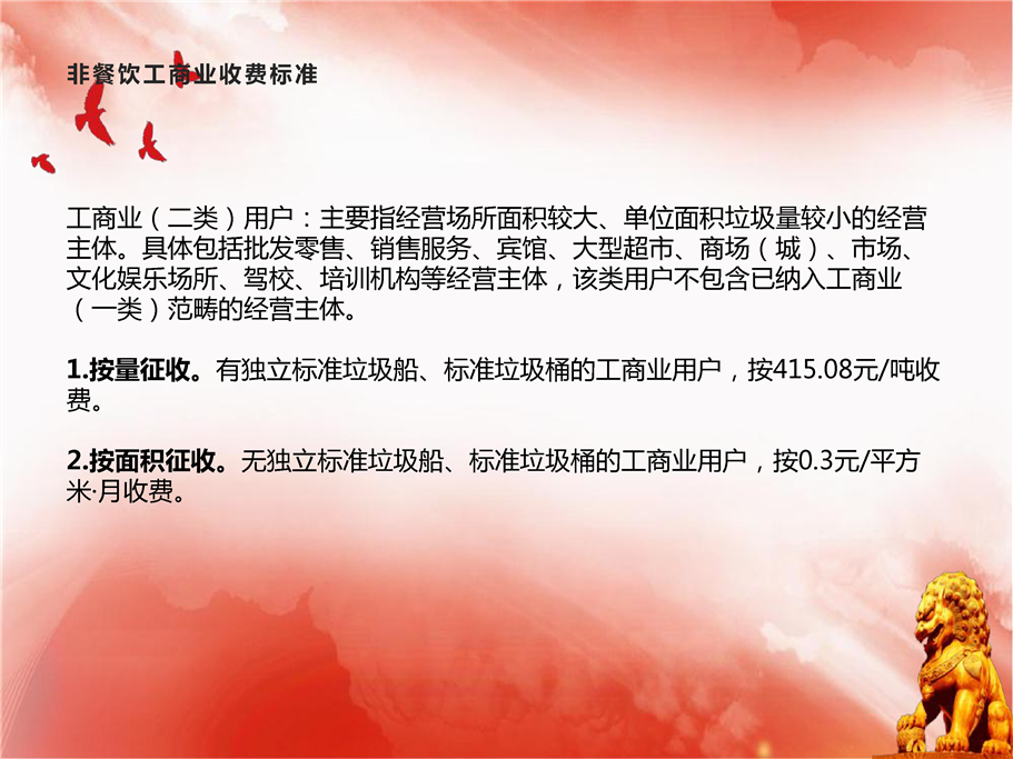 (2)工商业(二类)用户:主要指经营场所面积较大、单位面积垃圾量较小的经营主体。具体包括批发零售、销售服务、宾馆、大型超市、商场(城)、市场、文化娱乐场所、驾校、培训机构等经营主体,该类用户不包含已纳入工商业(一类)范畴的经营主体。
