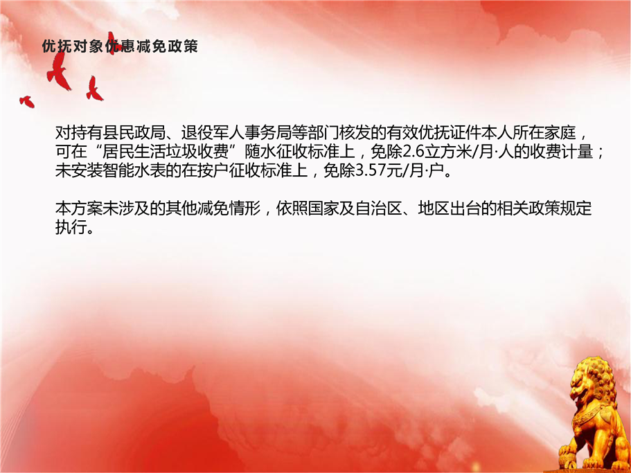 对持有县民政局、退役军人事务局等部门核发的有效优抚证件本人所在家庭,可在“居民生活垃圾收费”随水征收标准上,免除2.6立方米/月·人的收费计量;未安装智能水表的在按户征收标准上,免除3.57元/月·户。