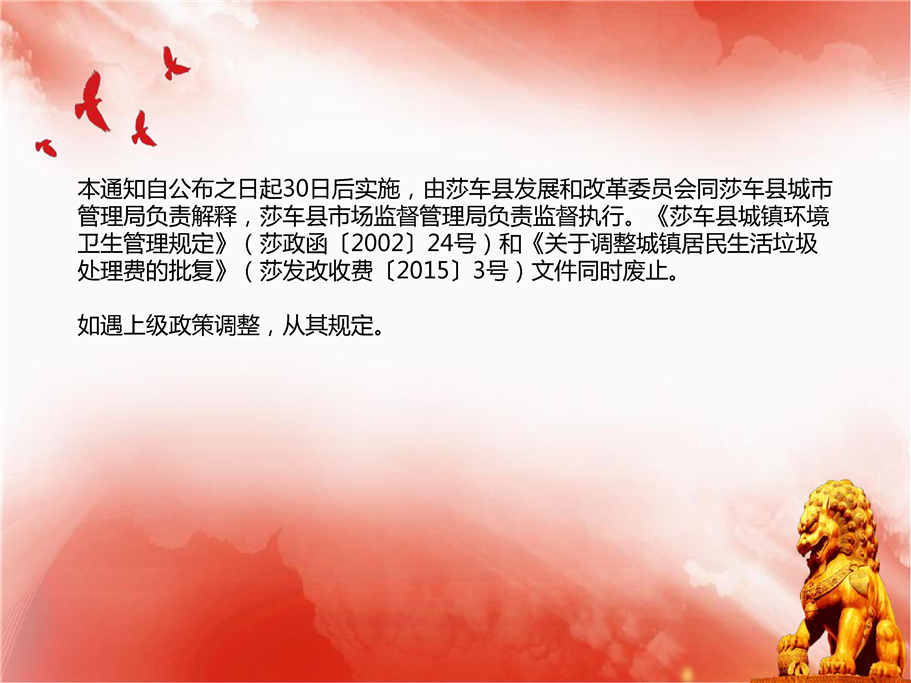 本通知自公布之日起30日后实施,由莎车县发展和改革委员会同莎车县城市管理局负责解释,莎车县市场监督管理局负责监督执行。《莎车县城镇环境卫生管理规定》(莎政函〔2002〕24号)和《关于调整城镇居民生活垃圾处理费的批复》(莎发改收费〔2015〕3号)文件同时废止。