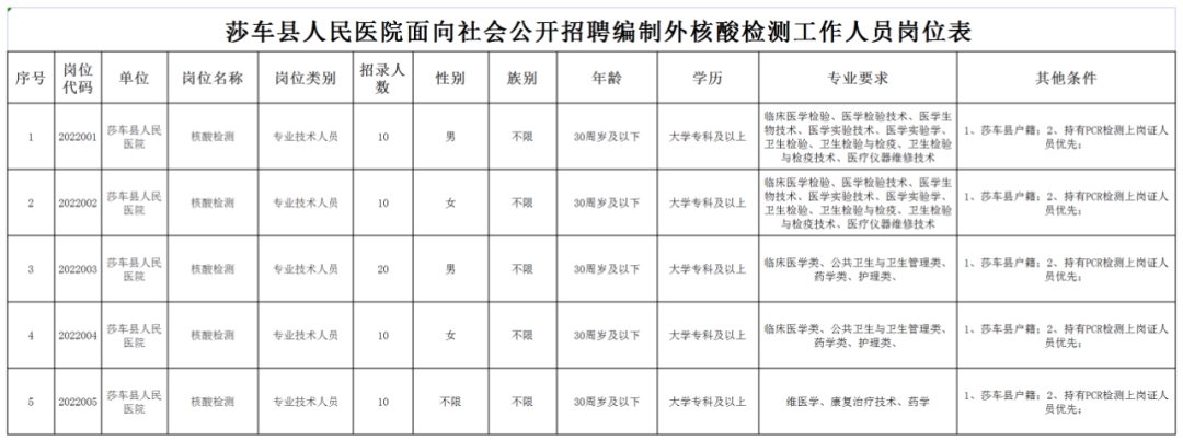 (三)招聘的60名核酸检测工作人员,将充实到莎车县PCR实验室从事核酸检测工作。