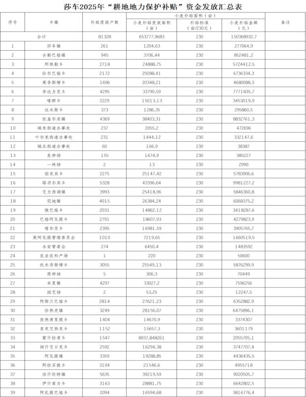 莎车县2025年“耕地地力保护补贴”发放结果公示