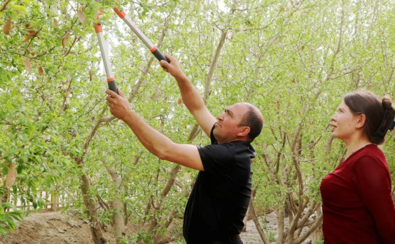村民布合力其木·艾力马吉在自家后院忙着对果树进行整形修剪和管护。她表示:“我在房前种了辣椒和万寿菊,万寿菊开花后,会有人上门收购,屋后还种了新梅和核桃树,这样房前有花有菜能换钱,屋后有果有树能尝鲜,一年四季都不闲着,日子过得充实又踏实。”