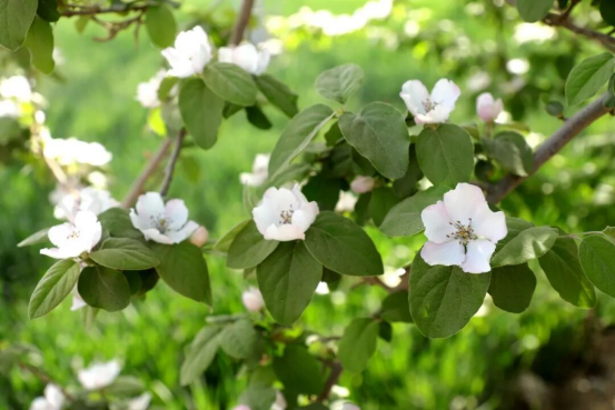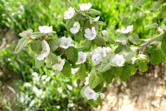 走进伊什库力乡榅桲种植基地,只见层层叠叠的榅桲花竞相绽放,粉白相间的花朵与翠绿的枝叶相互映衬,三五成群的蜜蜂在花丛间穿梭忙碌,处处洋溢着春日的生机与活力。游客们徜徉在花海中,举起手机定格眼前美景,欢声笑语回荡在田野间。