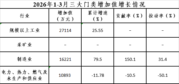 一季度,规模以上工业累计实现工业增加值27114万元,同比增长25.6%;增速较去年同期(14.1%)增长11.5个百分点。制造业实现增加值16221万元,同比增长79.5%;电力、热力、燃气及水生产和供应业实现增加值10893万元,同比下降11.8%;采矿业暂无规模以上工业企业。