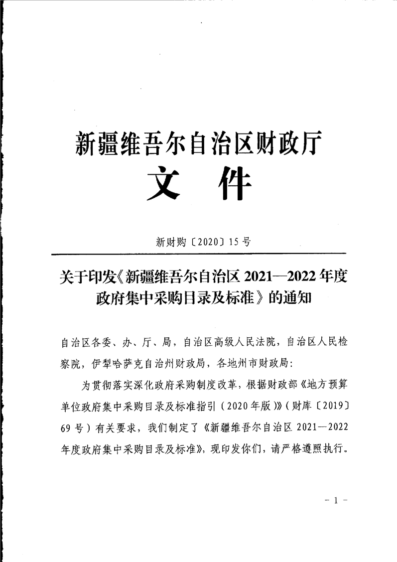关于印发《新疆维吾尔自治区2021-2022年度政府集中采购目录及标准》的通知