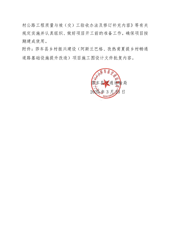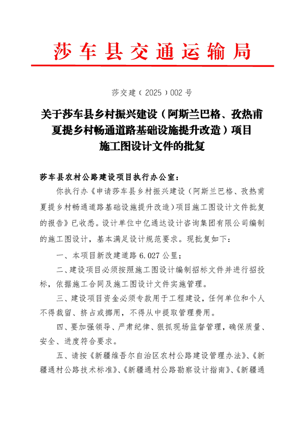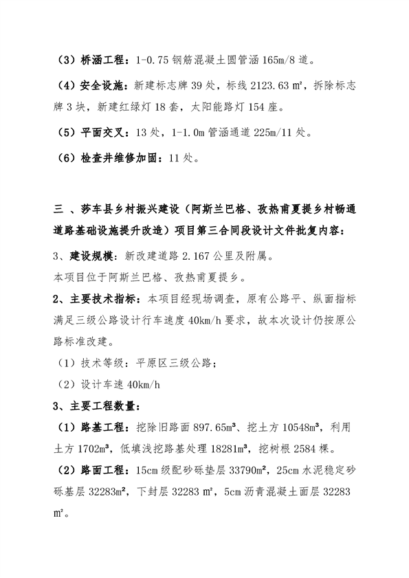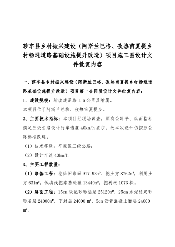 关于莎车县乡村振兴建设(阿斯兰巴格、孜热甫夏提乡村畅通道路基础设施提升改造)项目施工图设计文件的批复