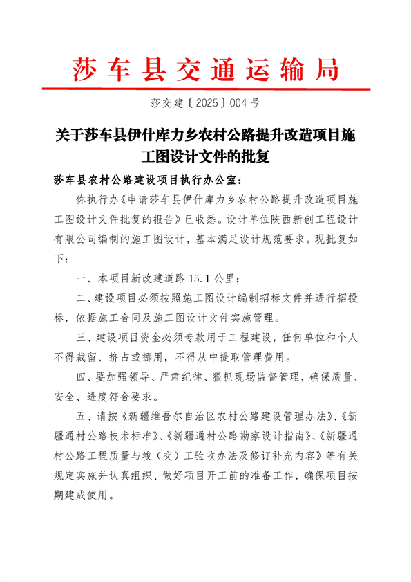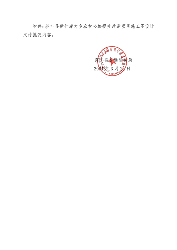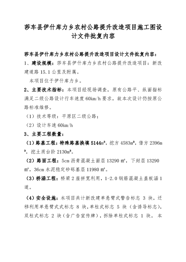 莎车县伊什库力乡农村公路提升改造项目施工图设计文件的批复