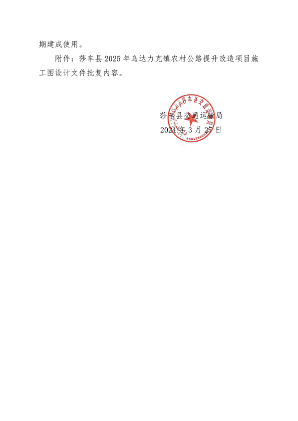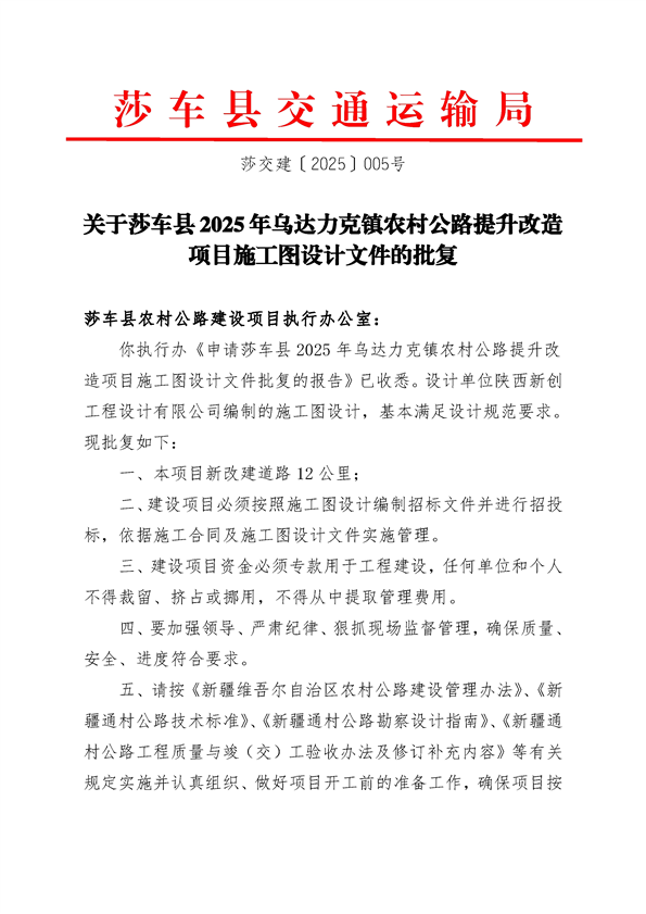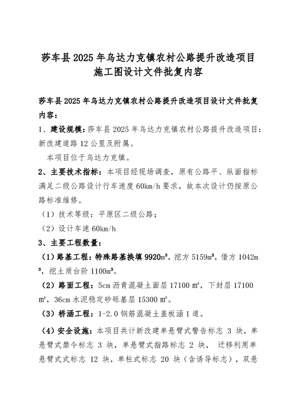 莎车县2025年乌达力克镇农村公路提升改造项目施工图设计文件的批复